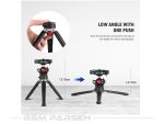 سه پایه را به طور کامل گسترش دهید تا به عنوان یک سه پایه رومیزی 7.5 اینچی/19 سانتی متری کار کنید. دکمه قرمز روی شاسی را فشار دهید تا پاها به اندازه 4.5 اینچ/11.5 میلی متر برای زوایای عکاسی بسیار کم قرار گیرند، یا آن را تا کنید.